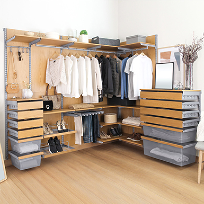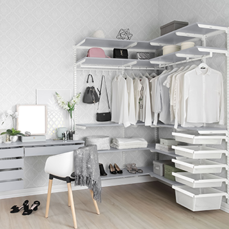 Customize yur walk-in closet with hanging spaces to maximize vertical usage, adjustable shelves and drawers to adapt to a changing wardrobe, drawer organizers for small items like jewelries and accessories, pullout or fixed racks for pants and shoes. The possibilities are endless for your personalized storage.